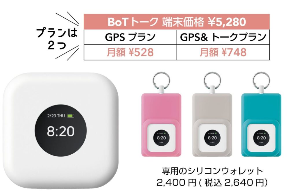 新モデルには見守りウォレットが備わっており、交通系ICカードと併用することで、乗り降りした駅や使った電子マネーの金額を把握することも可能。交通系ICカードとBoTトークを一緒に収納できる専用のシリコンウォレット(右写真)も用意されています。