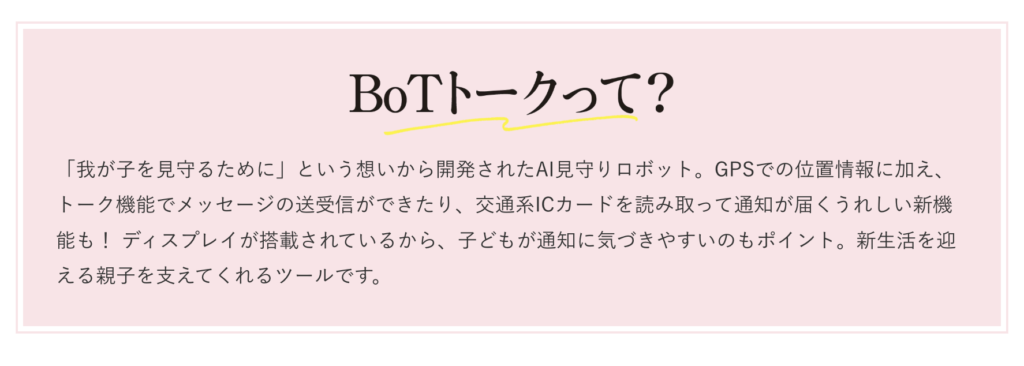 小学校入学とともにひとりでの行動も増えて子どもの成長がうれしい反面、心配がつきないママも多いもの。そんなママのお守りは、見守りGPS「BoTトーク」。見守りウォレット機能がついた新モデルが登場してよりパワーアップ! その魅力に迫ります♡